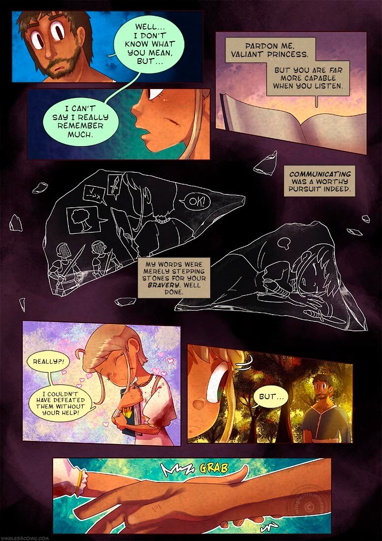 This guy is very suspicious. He says he can’t remember much, Bouquin’s sketch story made it look like he got knocked out and he looks like he got into a fight. Did he and Bouquin team up in hiding info? I’m not sure if Ephelia’s summoned monster disappeared but the dead man must’ve been Bouquin when the man retrieved him? A dead paladin doesn’t look good and a puddle of one doesn’t either…Really love the backgrounds for each of the panels here 🙂
